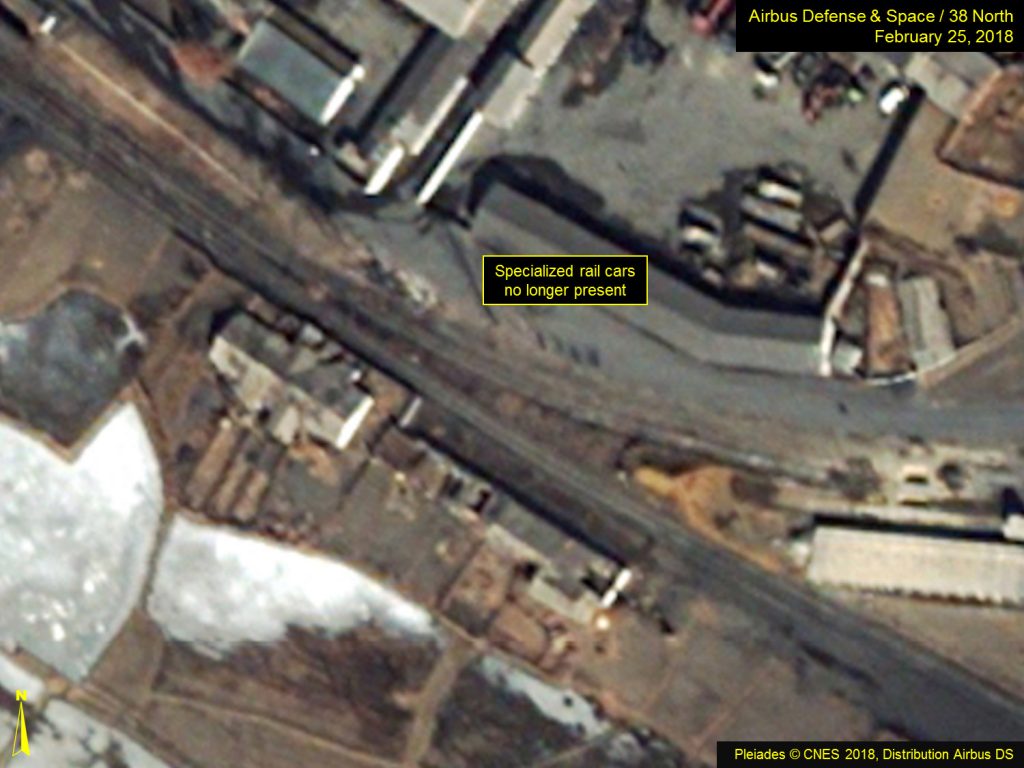 The unique “specialized” rail cars and three specialized depressed-well flatcars that were present in mid-February at the Pungang-ni Rail Yard (the main rail yard serving Yongbyon) are now gone. (Figure 12-13) The exact purpose of these unique rail cars remains unclear, although they have been observed at both the Radiochemical Laboratory and the southeast rail yard during previous reprocessing or refueling campaigns. However, there are no other means to verify that such activities have recently occurred.