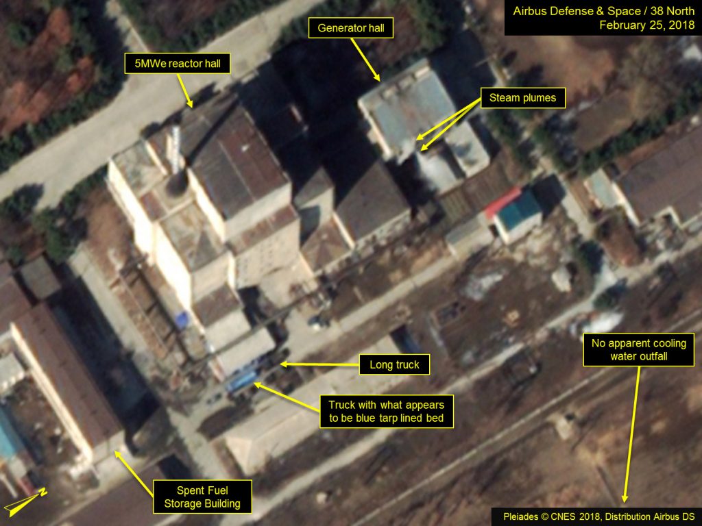 Additionally, two large open bed trucks were present at the rear of the 5 MWe reactor hall in imagery from February 17—one appears to have its bed lined with a blue tarp-like material. Such vehicles exhibiting this blue feature were observed at the rear of the reactor in 2015 and 2016 as well, but their exact purpose is unknown. Some possible explanations are that the trucks (both then and now) may be used to transport fresh nuclear fuel or carbon dioxide in containers to the reactor. If the one truck is indeed lined with a blue tarp, it may be meant to transport contaminated material or equipment away from the reactor.